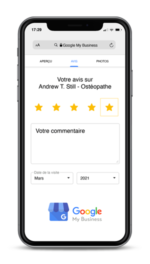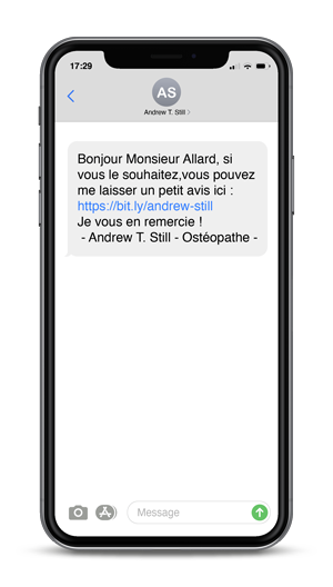 Le SMS est composé d'un texte que vous décidez et qui sera reçu par tous vos patients / clients. Exp : Bonjour Madame Allard, nous espérons que la séance s'est bien passée. Si vous le souhaitez, vous pouver me laisser un avis ici : [lien conduisant à la page d'avis]. Bien à vous, Le Cabinet d'Ostéopathie.